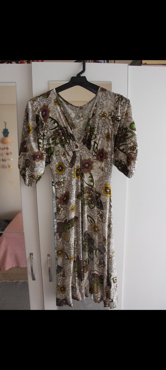 Gri ve kahverengi tonlarda, bohem desenli, kısa kollu, V yaka, elbise