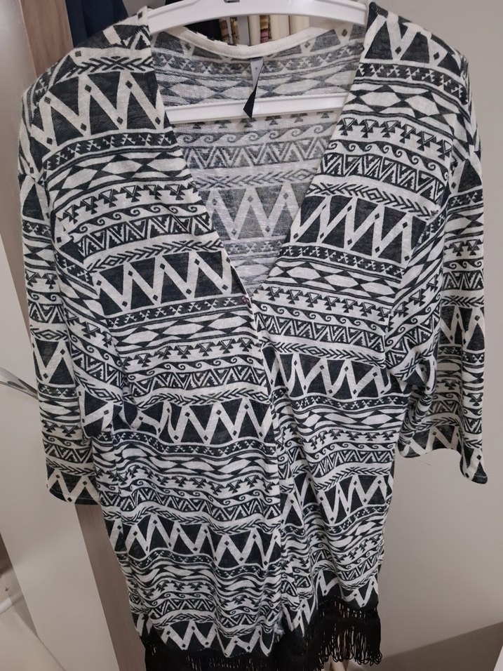 Gri renkte, bohem desenli, V yakalı, uzun kollu, kısa kesim bol hırka.. Günlük kullanıma uygundur.