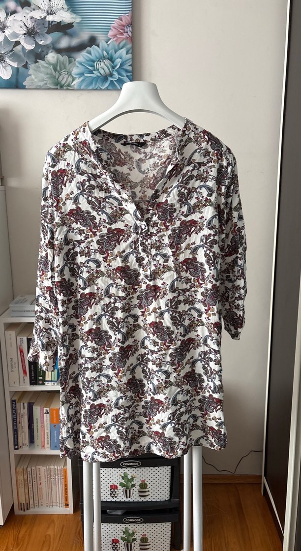 Pamuklu, bol kesim, V yaka ve uzun kollu kadın bluz. Düğmeli, bohem desenli ve midi boyda, günlük kullanım için uygun.