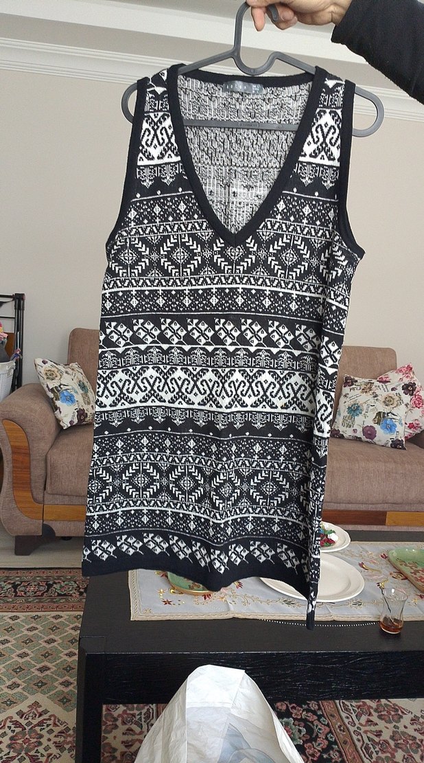 Bohem tarzı, desenli, V yakalı, kolsuz, rahat kesim kadın süveter. Günlük kullanıma uygundur.