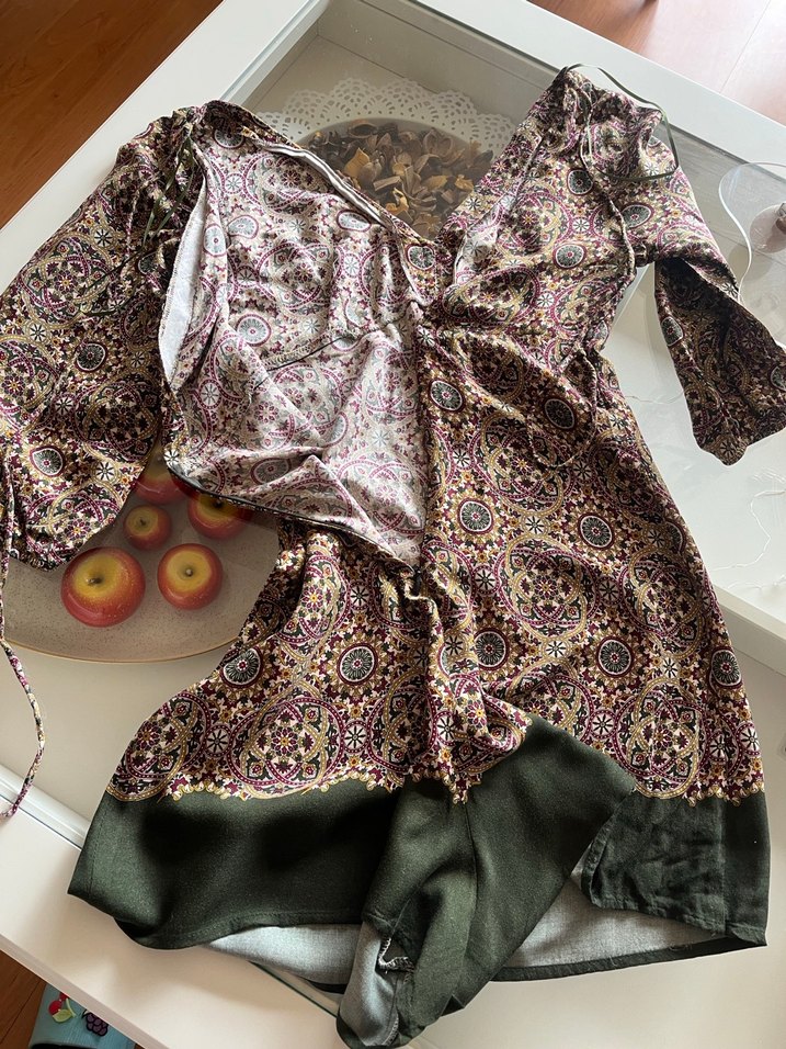 Bohem tarzda, şal desenli v yakalı boyundan bağcıklı. Short elbise Uzunluk 77 Kol uzunluğu 39 Paçalarda yeşil ağırlık 36 beden