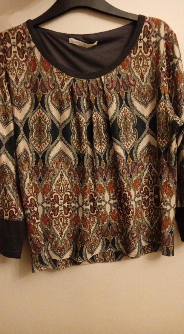 Bohem tarzda, bol kesim, uzun kollu, güderi yuvarlak yakalı kadın bluz. Kahverengi tonlarında desenli ve dökümlü kumaşla ofise uygun.