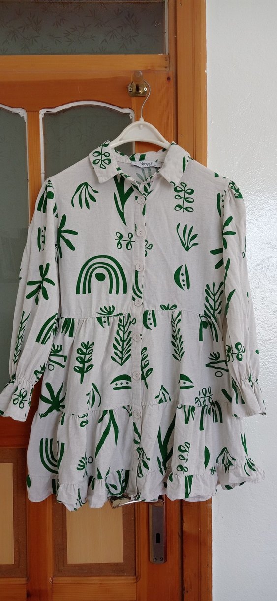 Yumuşak keten kumaştan, uzun kollu, düğmeli ve yakalı bohem desenli hafif yeşil bluz hamilelerde kullana bilir rahat kesimli, 42 beden ama 38 40 beden için uygun günlük kullanım için uygun.