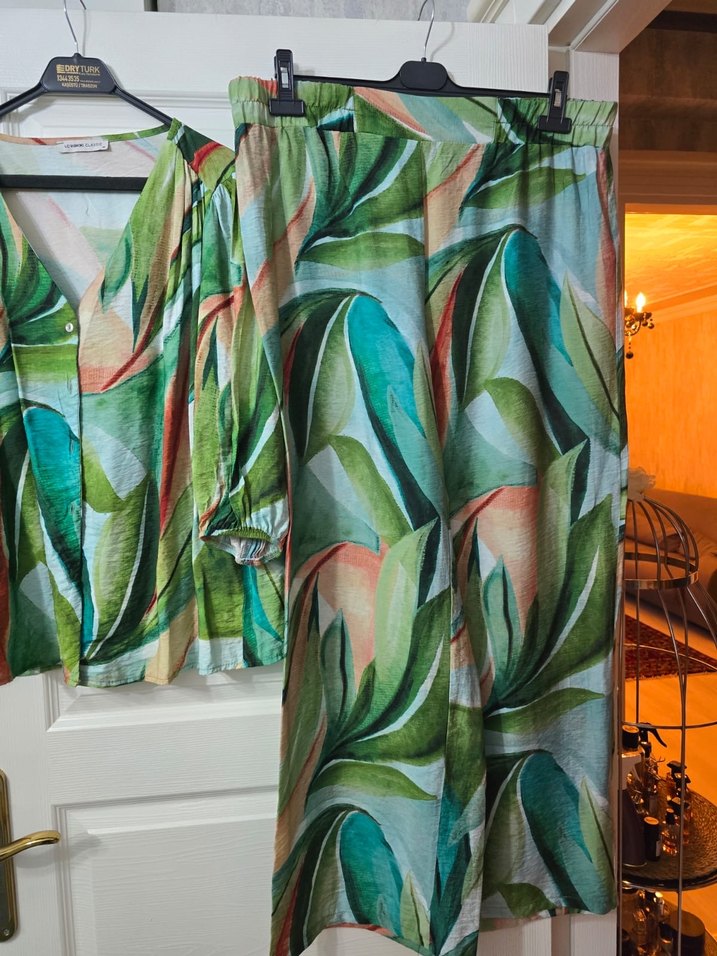 Uzun, bol kesim ve drapeli bu kadın pantolonları, açık yeşil bohem desenli yumuşak kumaştan üretilmiştir. Günlük kullanım için uygundur.