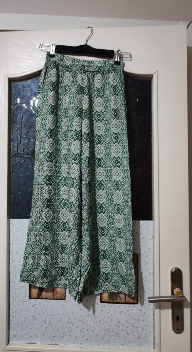 Uzun, pileli ve koyu yeşil bohem desenli kadın pantolon. Sentetik kumaştan, rahat kesimli ve günlük kullanıma uygun. Uzunluk 99 cm ağ ölçüsü 37 cm bel ölçüsü 30 lastikli iyi kumaşa sahip