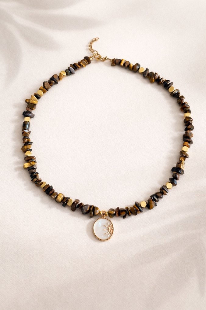 Koyu tonlu tie-dye boncuklar ve güneş figürlü altın renkli kolye ucu ile bohem tarz kısa kolye, günlük kullanım için uygundur.