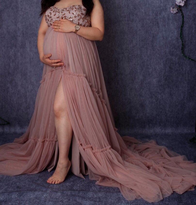 Bej renkli, straplez ve drapeli uzun hamile abiyesi. Yumuşak sentetik kumaştan, vücuda oturan kesim ve ince askılarla. Düğünler için bohem tarzda cesur model.