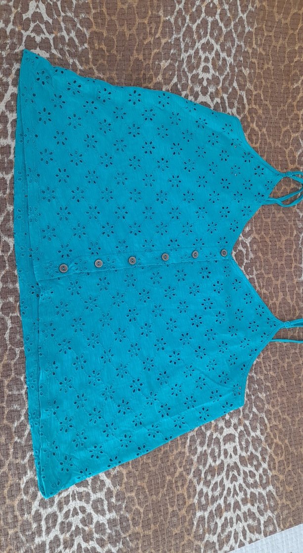 Turkuaz renkte, V yakalı, nakışlı ve düğmeli kısa boy bohem stilde atlet. Salaş kesimiyle rahat bir kullanım sunar.