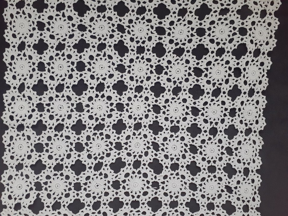 İnce bohem tarzı desenlerle süslenmiş beyaz el işi dantel örtü, dekorunuza el emeği dokunuşu katar.