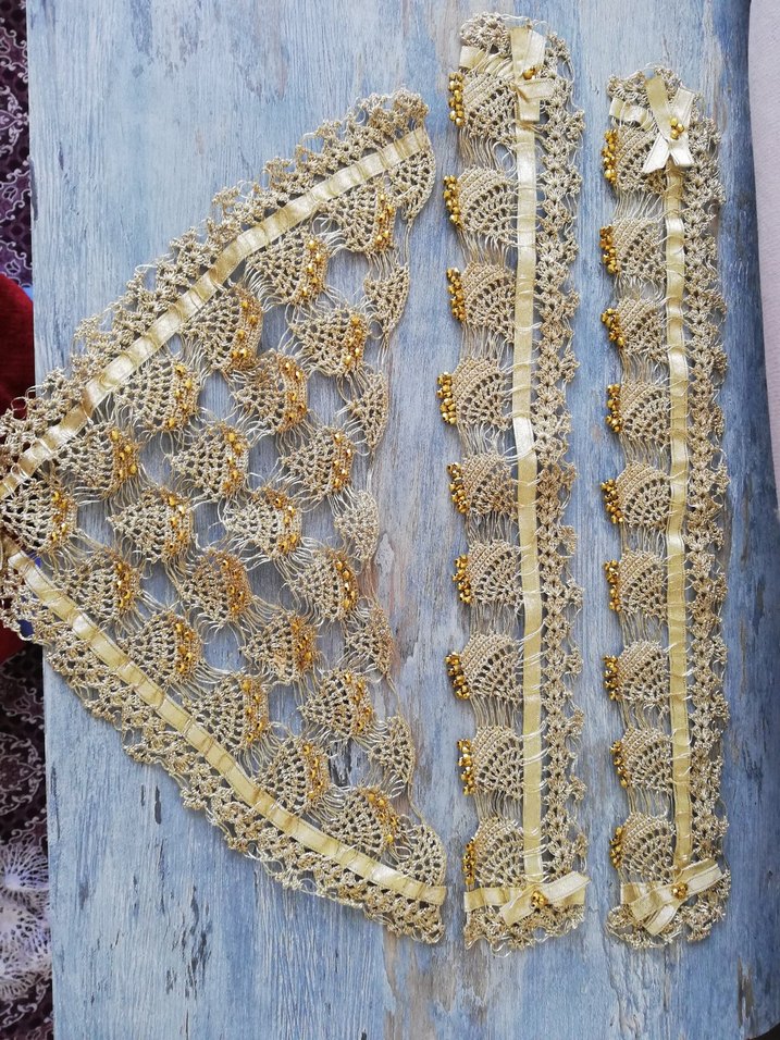 Altın detaylar ve ince kurdelelerle süslenmiş, el yapımı bohem dantel seti. Dekoratif kullanım için uygundur. ✨