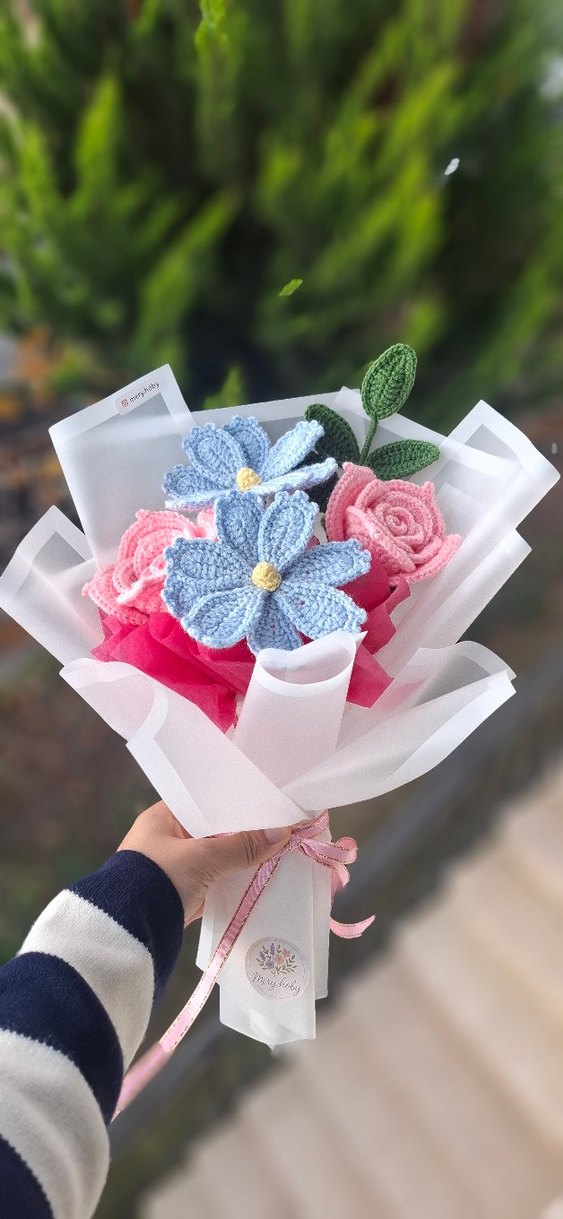 Bohem tarzda, el yapımı pembe ve mavi örgü çiçeklerden oluşan buket, saydam kağıda sarılıdır. Yeşil yapraklarla tamamlanmıştır.