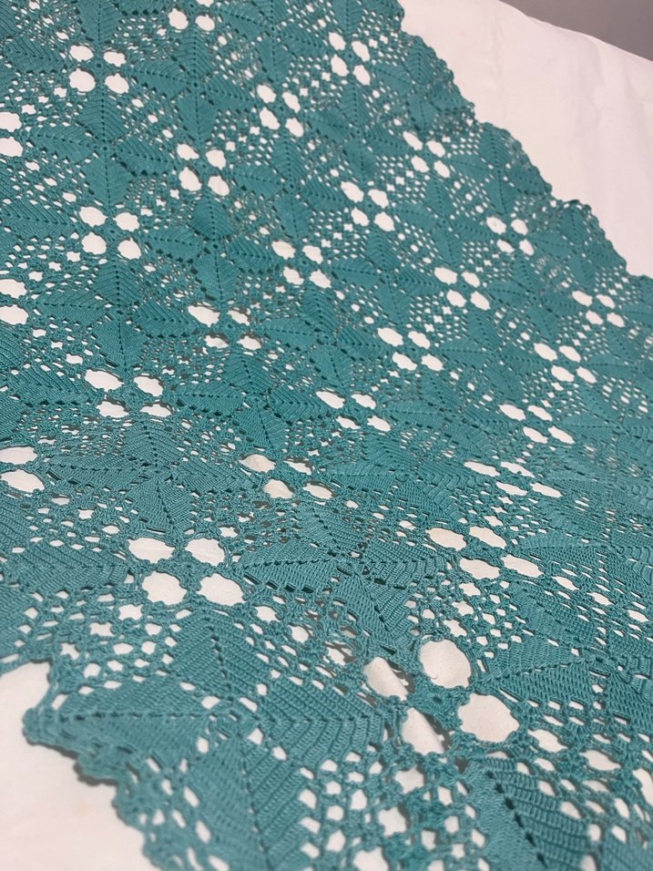 Bohem tarzda el yapımı, ince detaylı örgü masa örtüsü. Turkuaz renginde, masanıza sanatsal bir dokunuş katar. 75&75 sntm ölçülerinde