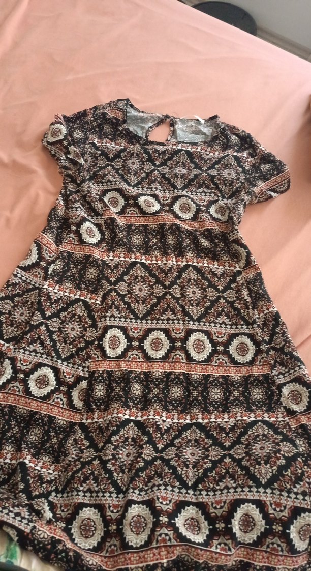 desenli, kısa kollu, bohem midi elbise. Günlük kullanıma uygundur. askıdan çekerken yırtıldı, üstüne oturan çok sevdiğim bir elbise