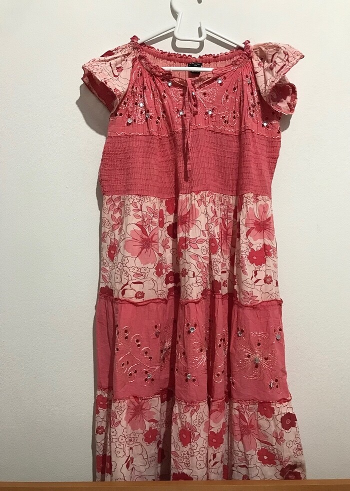 Çiçek desenleri, pulları ve kumaşıyla gerçek bir boho elbise. Kumaşı çok kaliteli bir pamuk, iç astarı bile 0 pamuktan. Çok rahat, bir o kadar tarz. Bol kesim, çoğu bedene olur. #y2k #boho #vintage #hippie #dress #00s #90s #80s #pink #red #star #glitter #shine #lastikli