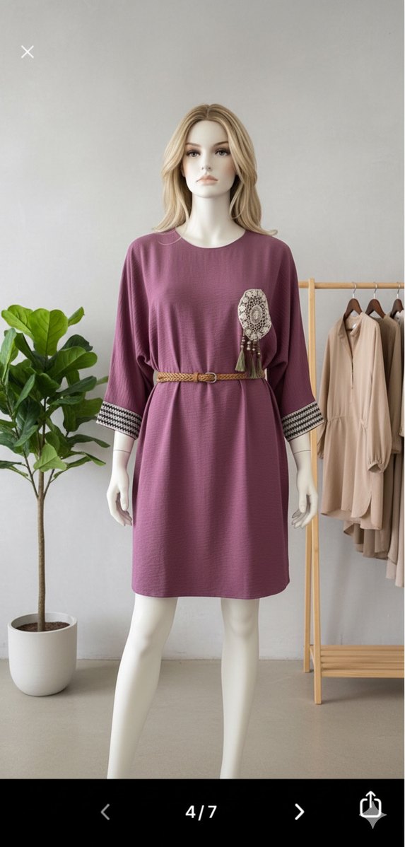 Bohem tarzda, etnik desenli manşetlere sahip, yuvarlak yakalı, yarasa kollu, mor elbise. Pastel tonlarda, rahat sentetik kumaştan üretilmiştir. Sıfır. Etiketsiz. Marka ve kemer temsilidir.