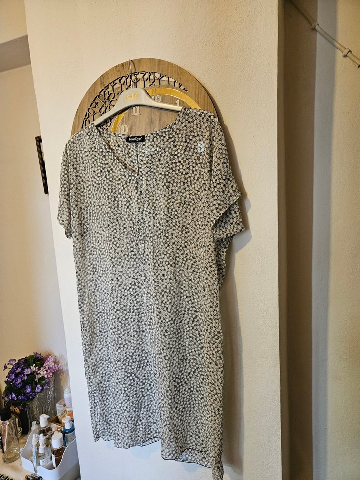 Bohem tarzı, kısa kollu, V yakalı, poreo elbise , salaş kesim ve gri renkte.