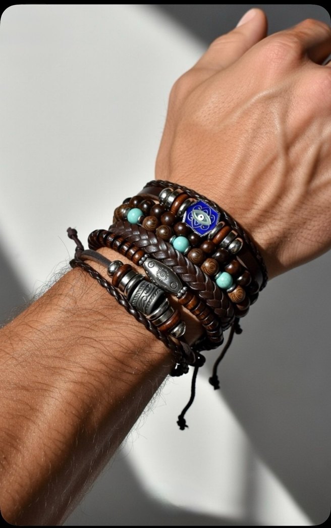 Bohem tarzı erkek bileklik seti, koyu kahverengi boncuklar, turkuaz detaylar ve metal süslemeli örgülü deri parçalar içerir.