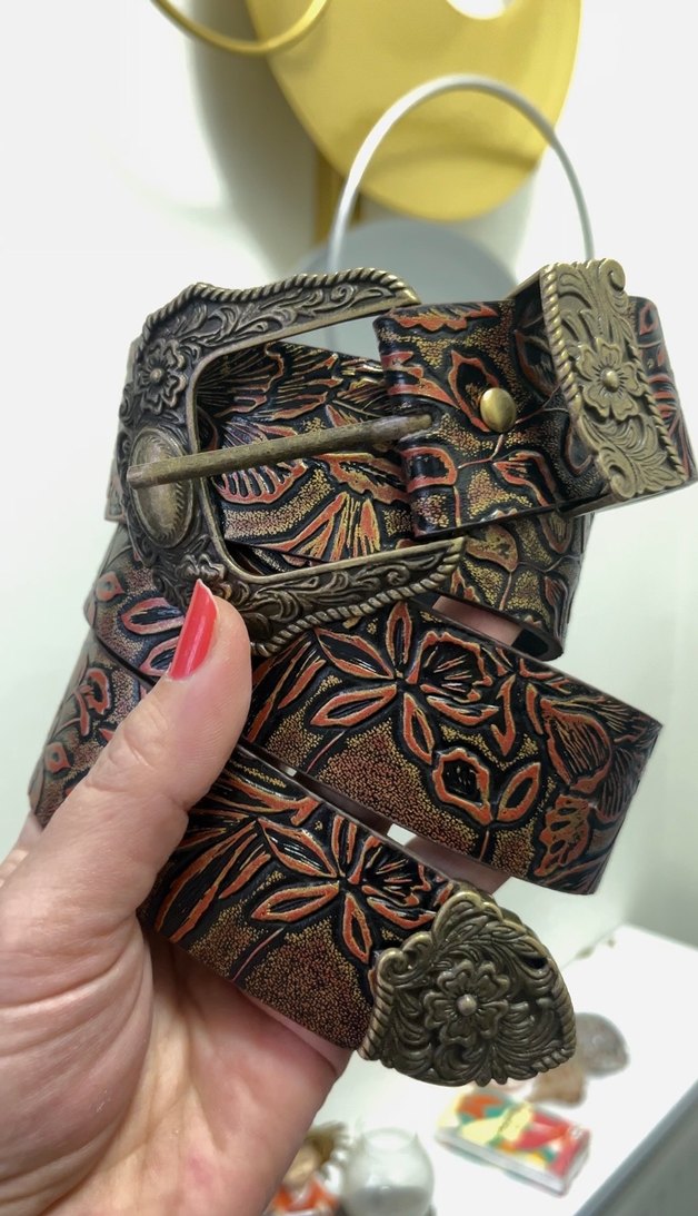 Koyu kahverengi deri kadın kemer, vintage çiçek desenli ve süslü tokalı, bohem tarz için uygun. Uxunluk 113cm en 3.7cm dir