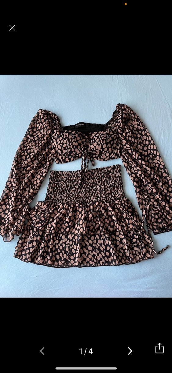Kahverengi mini etek, bol kesim ve fırfır detaylarına sahip, bağlama detaylı, bohem tarzda dış mekan kullanımı için uygun.