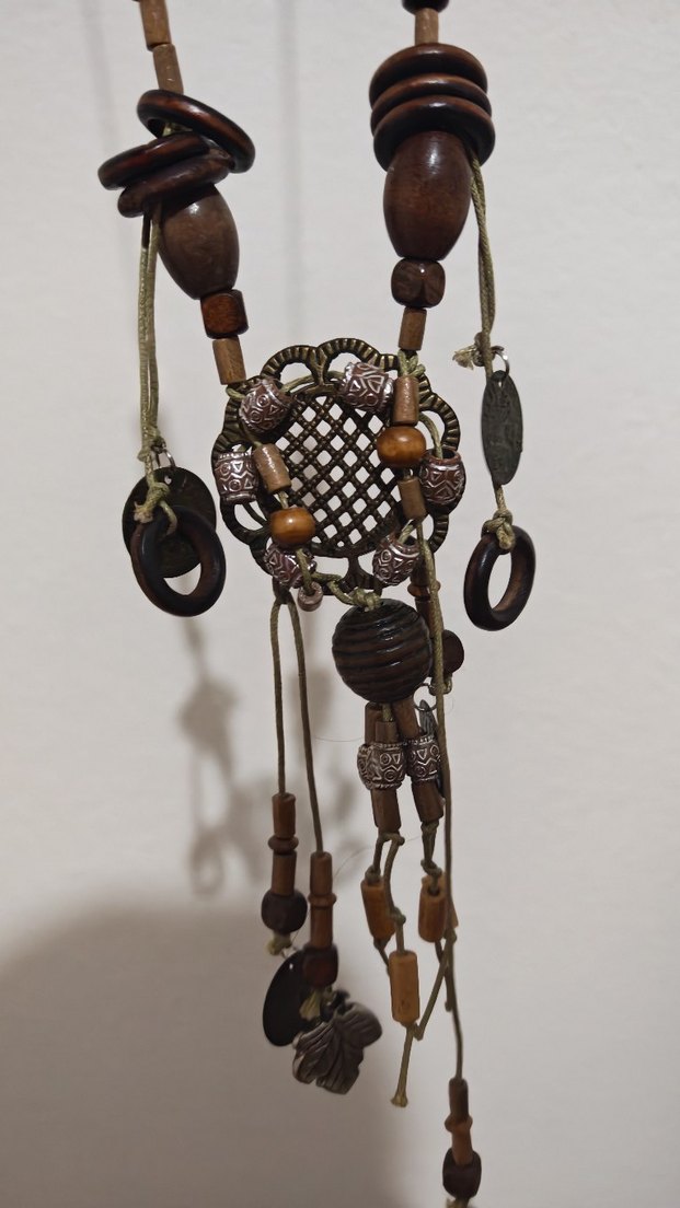 Uzun uzunlukta, koyu kahverengi boncuklar ve etnik desenlerle bezenmiş, ahşap ve metal detaylı bohem tarzda kolye. Günlük kullanım için uygundur.