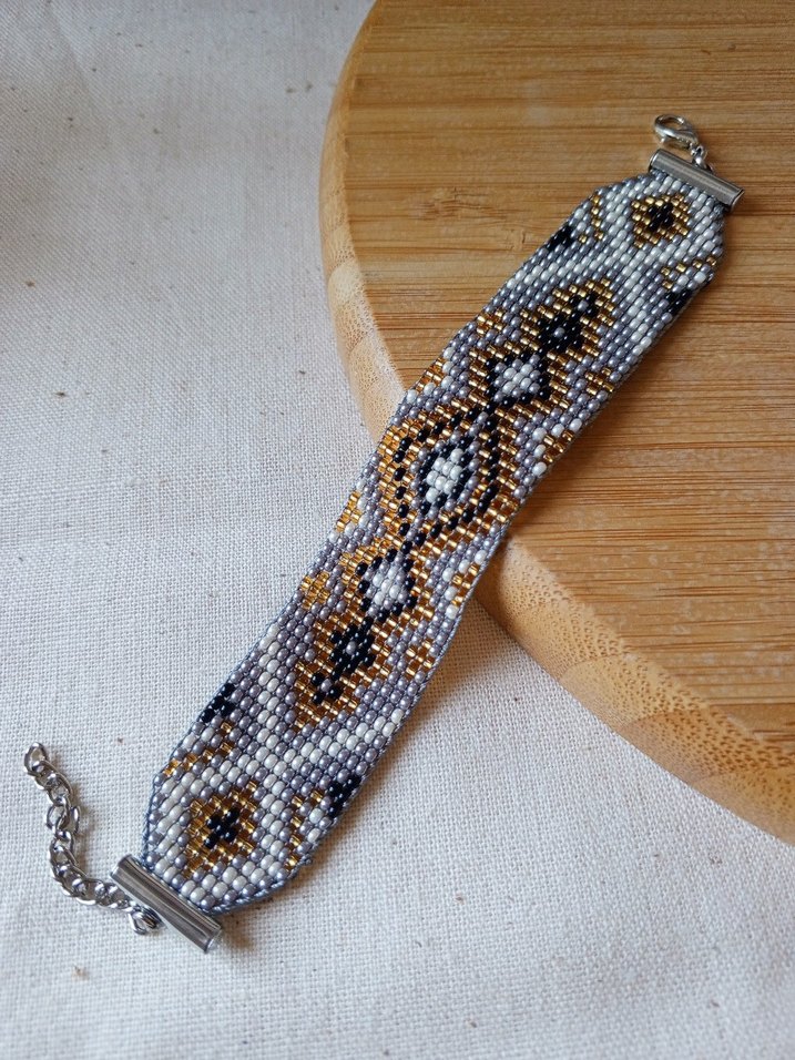 Gri tonlarında etnik desenli boncuklu bileklik, bohem tarzı ve günlük kullanım için uygun.