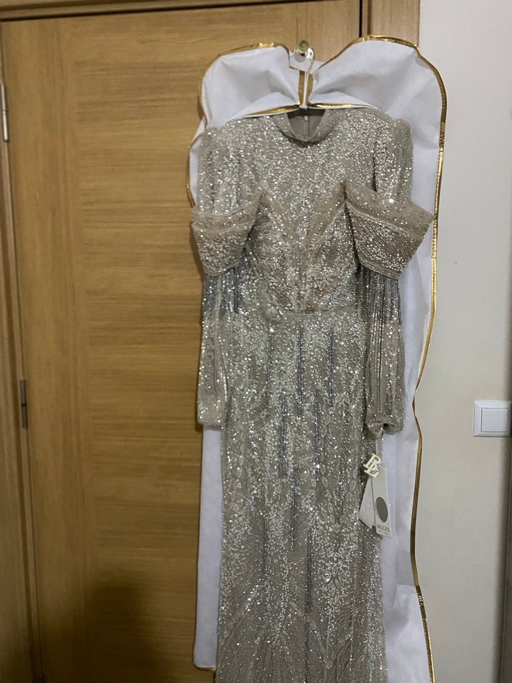 Uzun boy, regular fit ve yakalı bu tesettür nişan elbisesi, uzun kollu ve drapeli etnik desenlere sahip. Açık camel renginde bohem tarzını yansıtıyor.