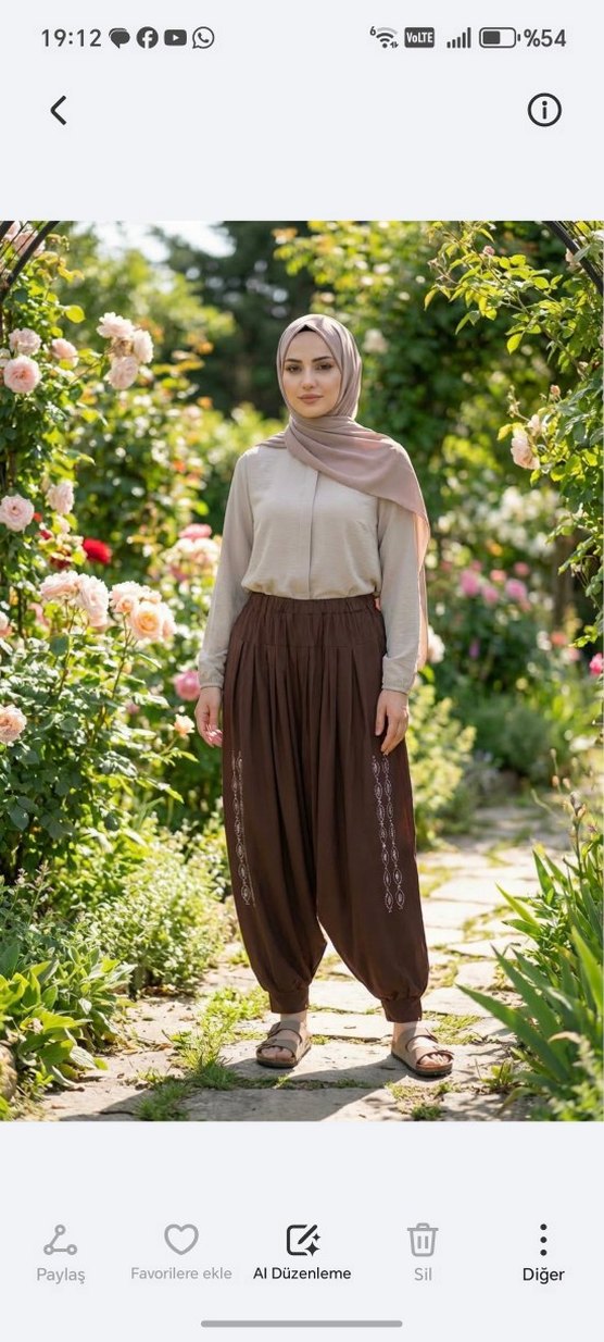 Kadınlar için salaş kesim, midi boy, drapeli ve etnik desenli pantolon. Koyu bej renkte ipeksi kumaştan, günlük kullanıma uygun bohem ve mütevazı tarzda.
