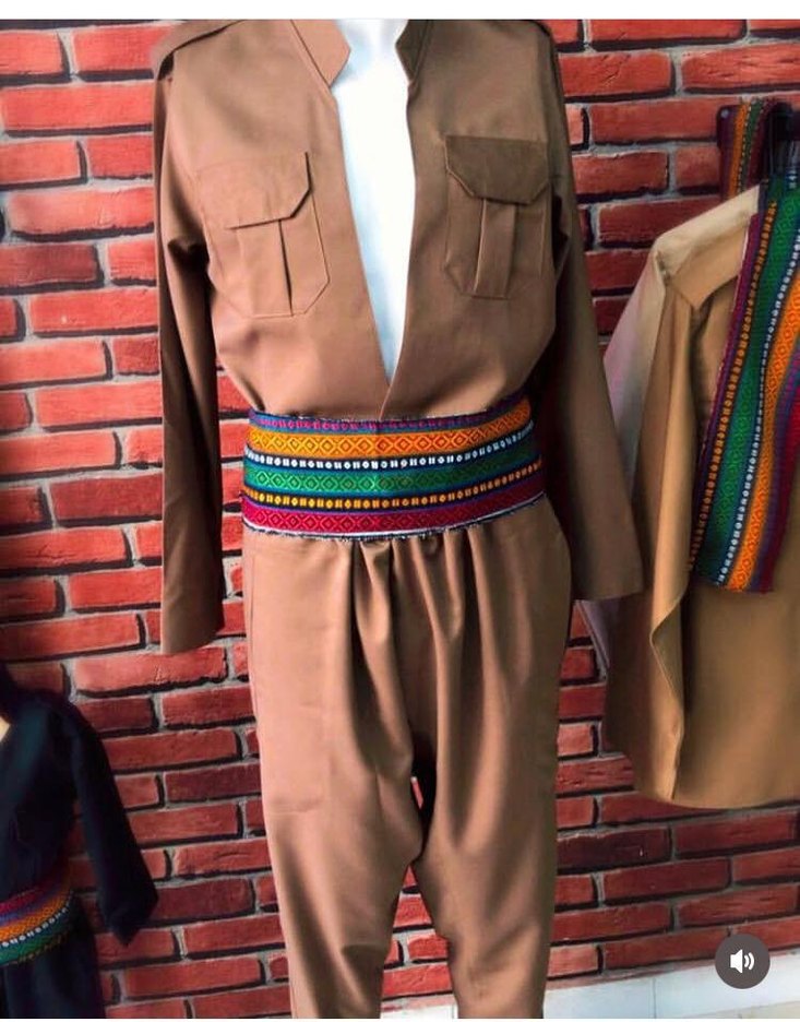 Camel renginde, kemerli erkek tulumu etnik desenli kemer ve iki ön cep ile birlikte notlu yaka ve uzun kolludur. Rahat kesimdir.