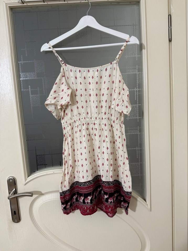Bu beyaz mini elbise, askılı ve dökümlü tasarımıyla bol kesimdir. Etnik desenli ve rahat tekstil malzemelidir, günlük kullanım için uygundur.