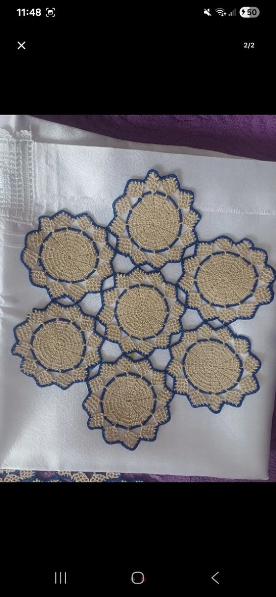 Bej ve mavi detaylarla el yapımı bohem tarzı dantel örtü, yuvarlak çiçek desenli. Dekora rustik bir dokunuş katar.
