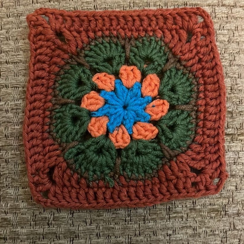 Mavi, turuncu ve yeşil iplerle yapılmış çiçek desenli bohem tarzı örgü kare. El işi projeleri için uygun. El örgüsü kare motif, çeşitli renklerdeki iplerle örülmüştür. Dekoratif amaçlı kullanılabilir.Coton iplerle örülmüştür,istenilen sayıda sipariş üstüne örülür,tane fiyatı 30 tl dir
