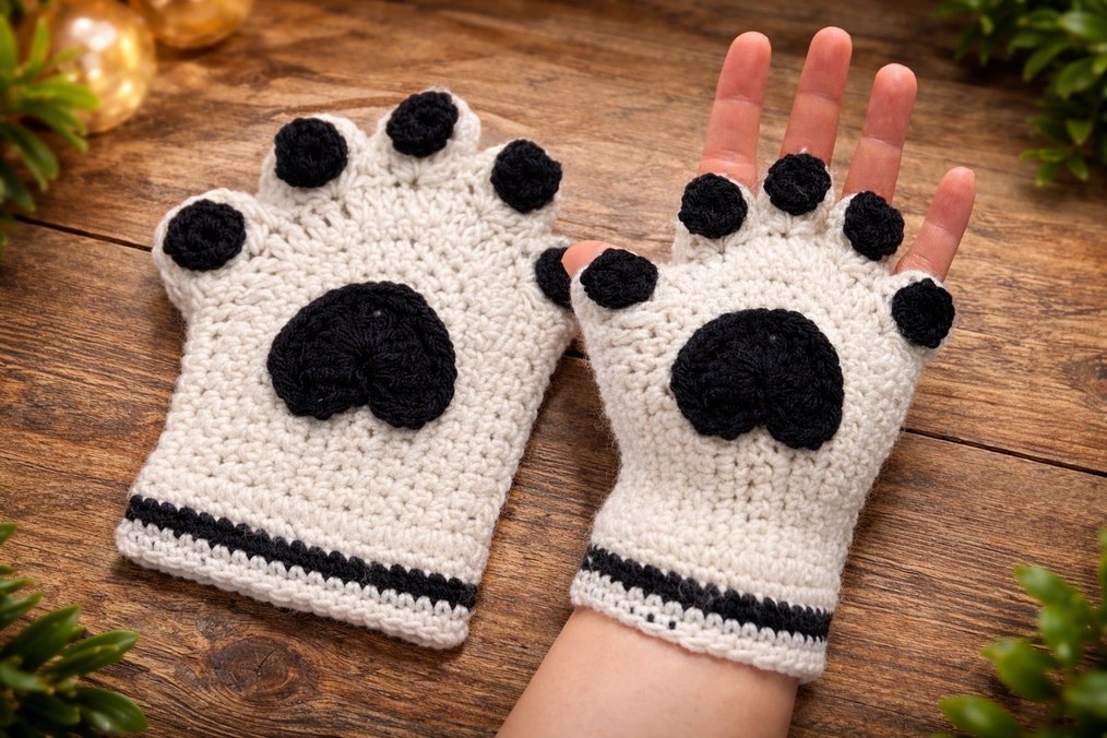 Beyaz ve siyah pati desenli, örgü bohem tarzı kadın eldiveni, rahat ve retro bir görünüm sunar.