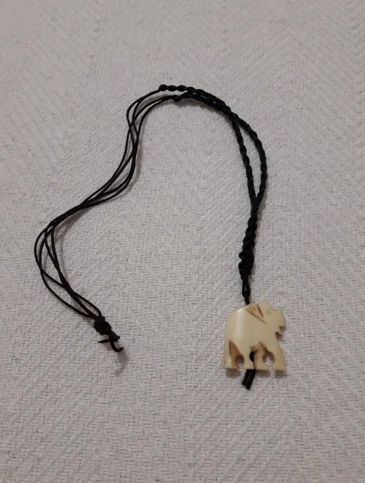 Uzun, bej renkli bohem tarzda boncuklu kolye, koyu örgülü ipte fil figürü bulunur.