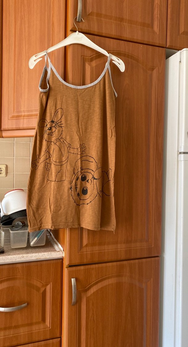 Askılı, desenli, bol kesim camel hamile elbisesi. Örgü dokuma kumaştan, günlük kullanıma uygundur.