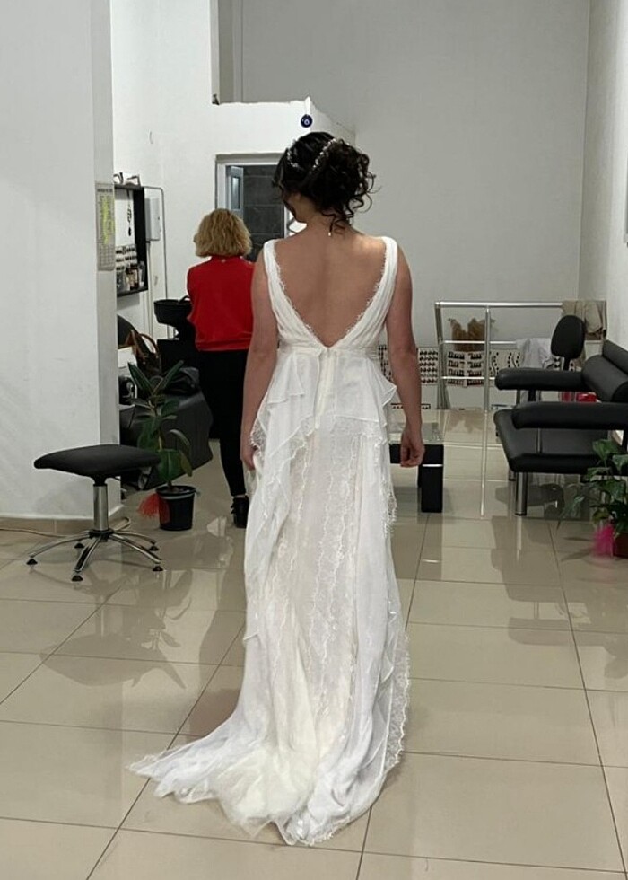 Gelinlik bir kere ve sadece salonda giyilmiştir. Kuru temizleme yapılmıştır. Hiçbir leke, bozulma bulunmamaktadır. Orijinal gelinliğin yakası bir miktar kendi danteli ile kapatılmıştır.