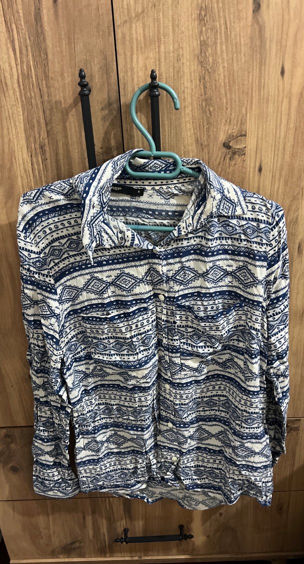 Bohem tarzda, uzun kollu, yakalı ve düğmeli gömlek. Mavi tie-dye desenli, bol kesim ve tekstil malzemeden üretilmiştir. Günlük kullanıma uygundur.