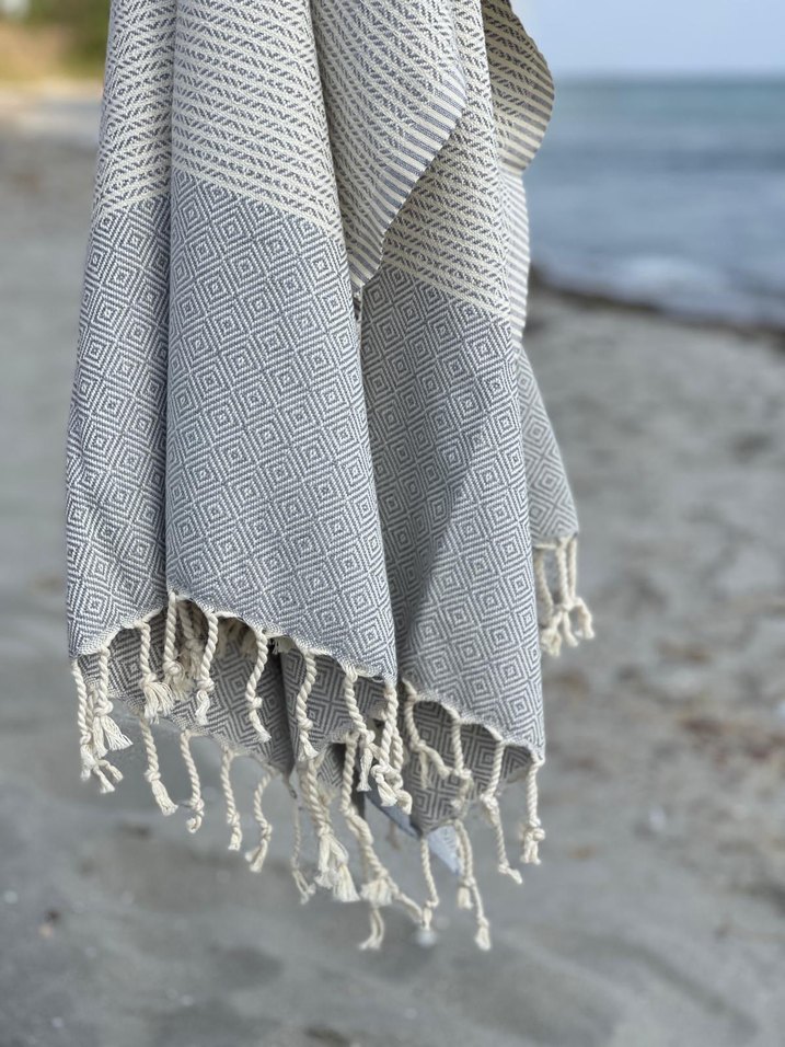 Gri renkte, bohem tarzda bağlamalı desenli ve püsküllü kenarları olan peştemal.