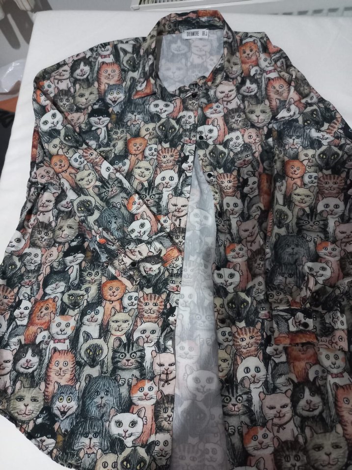 Bohem tarz gri, bol kesim uzun kollu, yakalı ve düğmeli kadın gömlek. Renkli kedi baskısı ile günlük kullanıma uygun. Etikette L beden yazıyor fakat xxl bedene kadar giyilebilir.