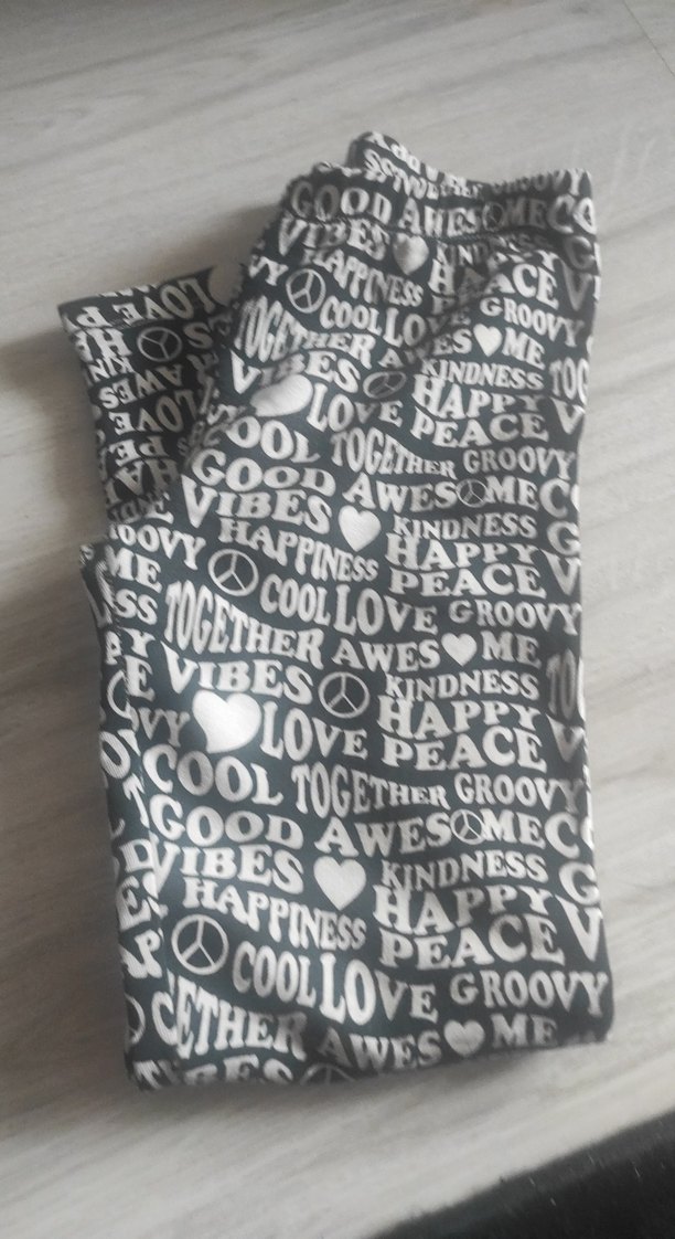 Gri pamuklu, bol kesim, bohem tarz baskılı kız taytı. İçinde kindness, peace, love gibi kelimeler bulunur. Rahat ve günlük stil.