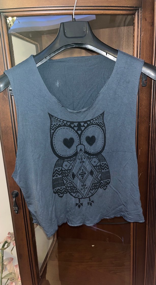 Bohem tarzı gri, kolsuz, baskılı baykuş desenli, yuvarlak yakalı, yumuşak dokulu üst