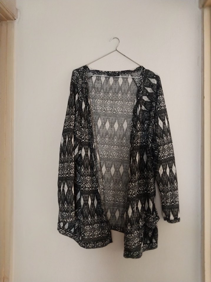 Gri tonlarında batik desenli, uzun kollu, V yakalı, bol kesim kadın hırka. Günlük kullanıma uygun drapeli tasarım.