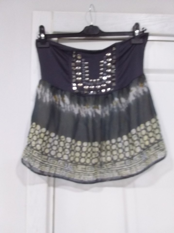 Gri renkte, batik desenli, kemerli ve bol kesim mini straplez bluz. Üst kısmında dekoratif metal detaylar bulunur, parti için uygundur. asıl ışık bluz, straplez bluz, şifon, önün parlak metal işlemeli, astarlı, straplez, çok yumuşak penye astarlı, L beden, iki koltuk arası 43cm+43cm, boyu 44cm, göğüs altından lastikli kiloş oluyor, göğüs kısmı penye etek kısmı astarlı şifon, sorunsuz