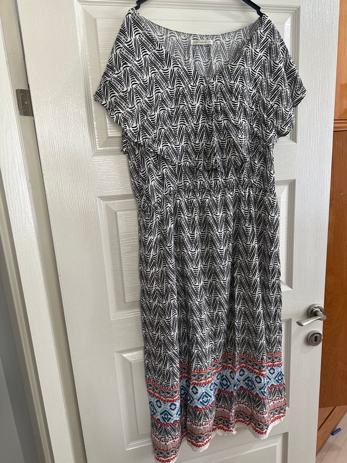 Kısa kollu, tekne yakalı, pile detaylı bol kesim uzun hamile elbisesi. Gri batik desenli, etek kısmında renkli detaylar bulunur. Günlük kullanım için uygundur.