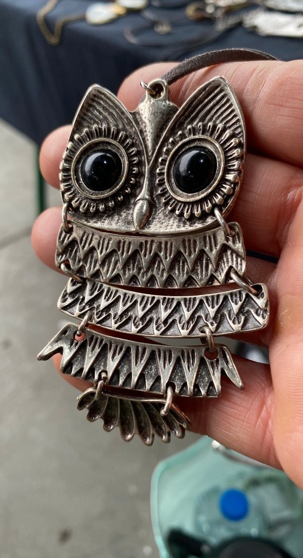 Bohem tarzda, desenli gri baykuş figürlü, tokalı midi uzunlukta günlük kullanıma uygun kolye.