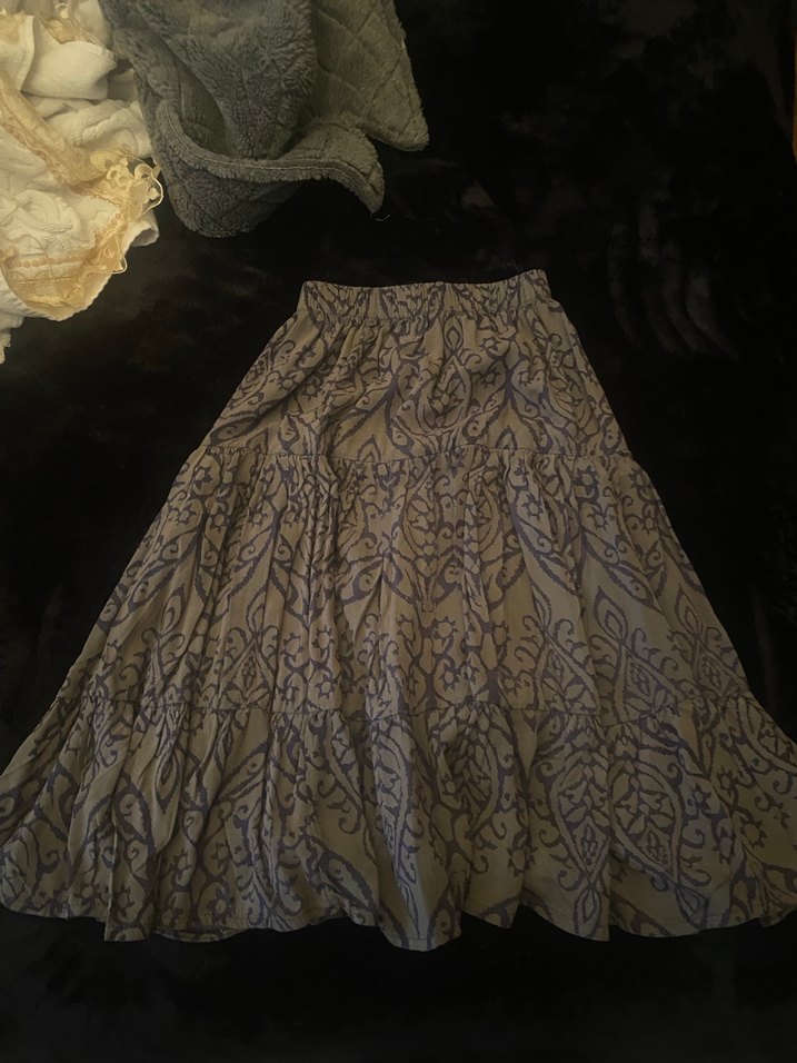 Bohem tarzda, drapeli, bol kesim uzun kadın eteği, bej ve gri tonlarda, yumuşak tekstil kumaştan. Düğünler için uygundur. dizinde kalıyor