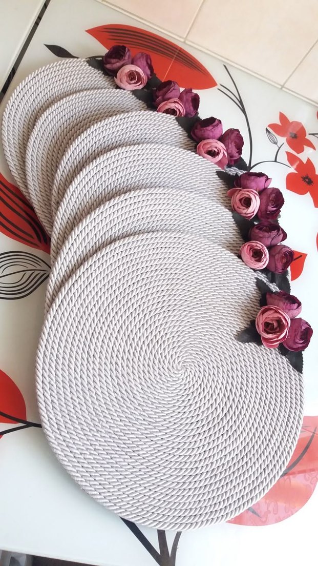 Bohem tarzı, gri ve beyaz renklerde yuvarlak Amerikan servisler. Çiçek desenli, masa düzeninize şık bir dokunuş katıyor. el örgüsü supla seti adet fiyatıdır