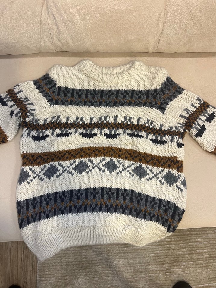 Bohem tarzda, gri, beyaz ve kahverengi desenli, yuvarlak yaka, bol kesim örgü erkek çocuk kazak. Rahat kullanıma uygundur.İyi durumda hiç tülerme yoktur.11/12 yaş için uygundur.