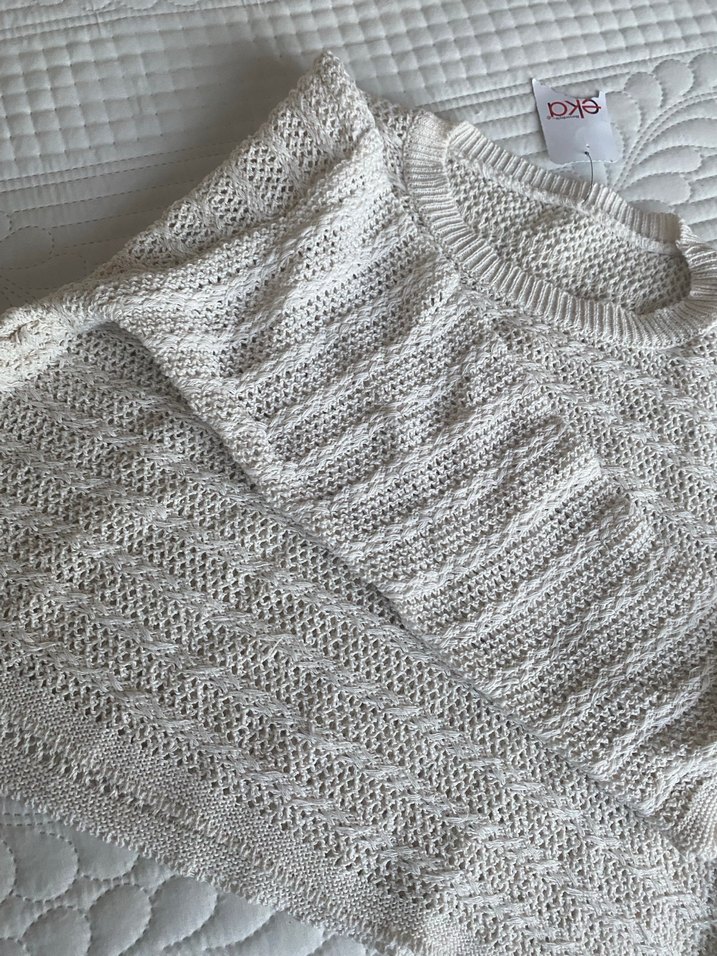 Gri beyaz tonlarda, örgü kumaştan yapılmış, uzun kollu ve salaş kesim bohem tarzda kadın kazak. Günlük kullanıma uygun, kayık yaka detaylı.