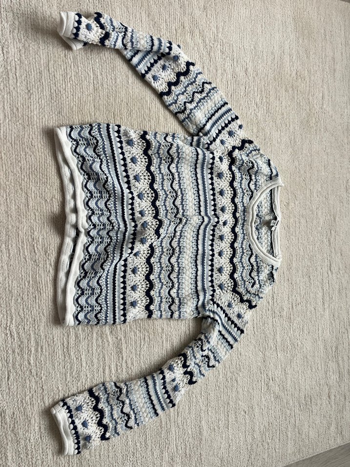 Gri ve beyaz renklerde, örgü desenli, uzun kollu ve yuvarlak yakalı bohem tarzda, günlük kullanıma uygun dar kesim kadın kazak.