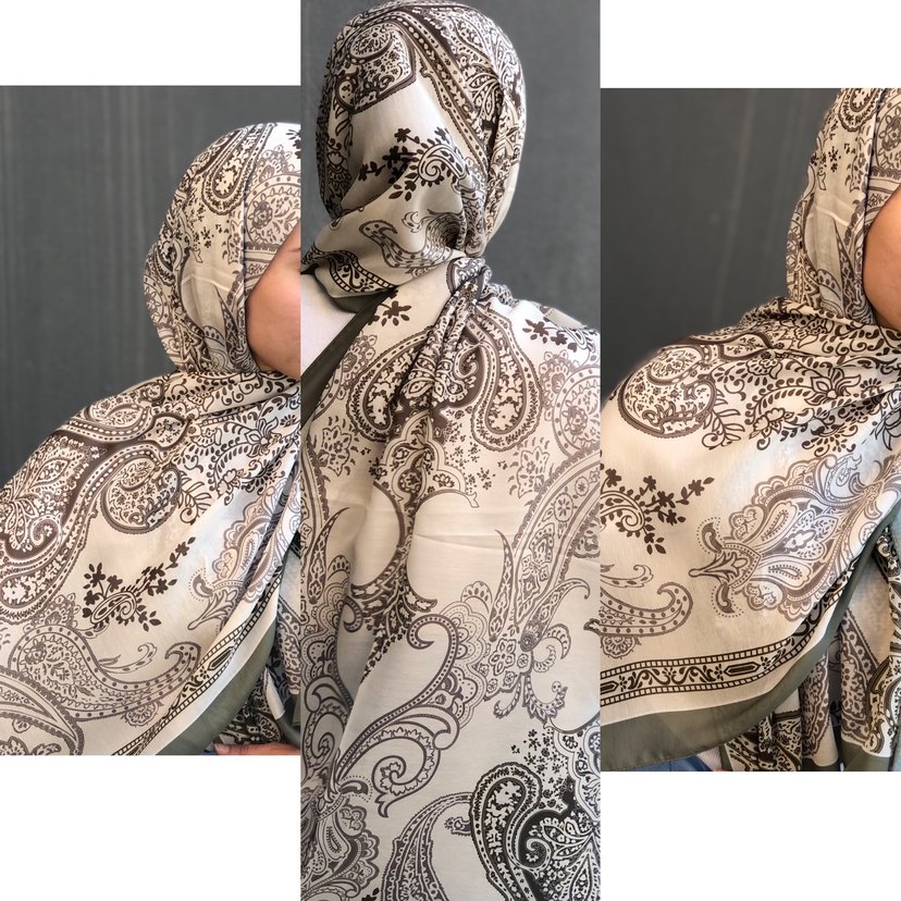 Bohem tarzda, gri-beyaz paisley desenli, saten dokulu, dökümlü kadın şalı. Zarif ve mütevazı bir görünüm sağlar.